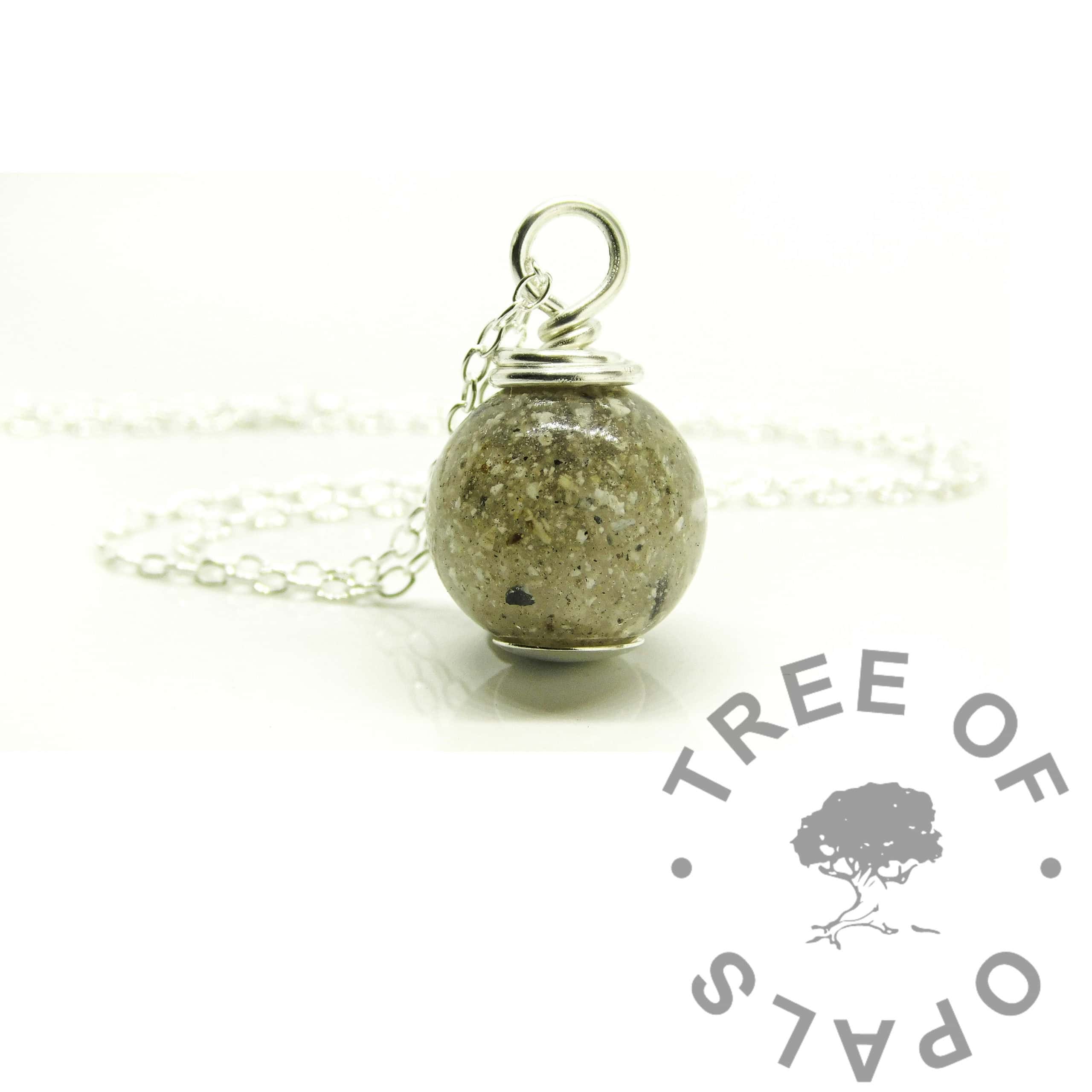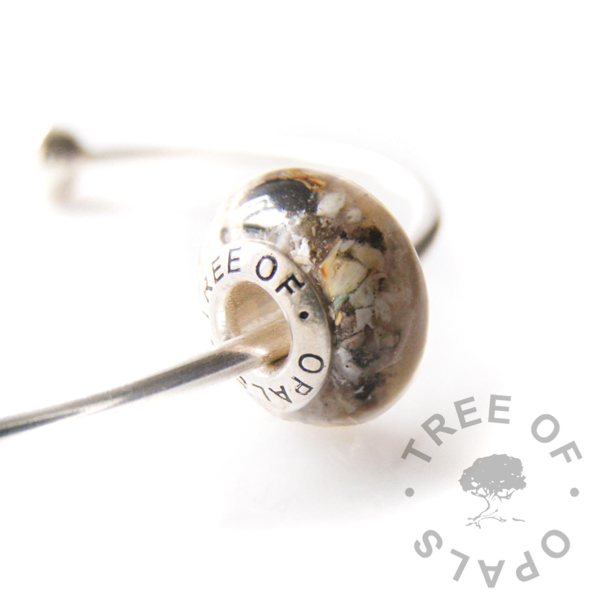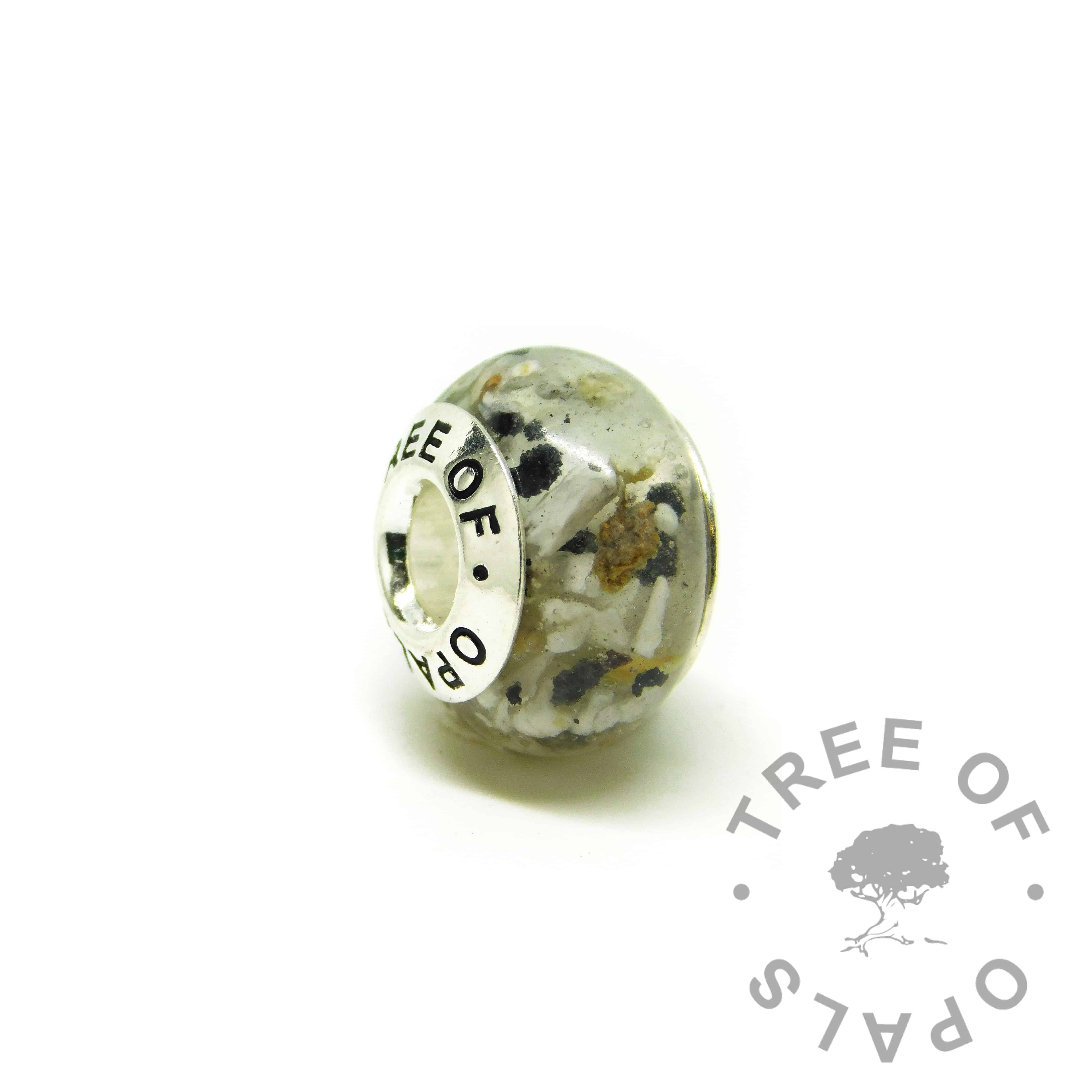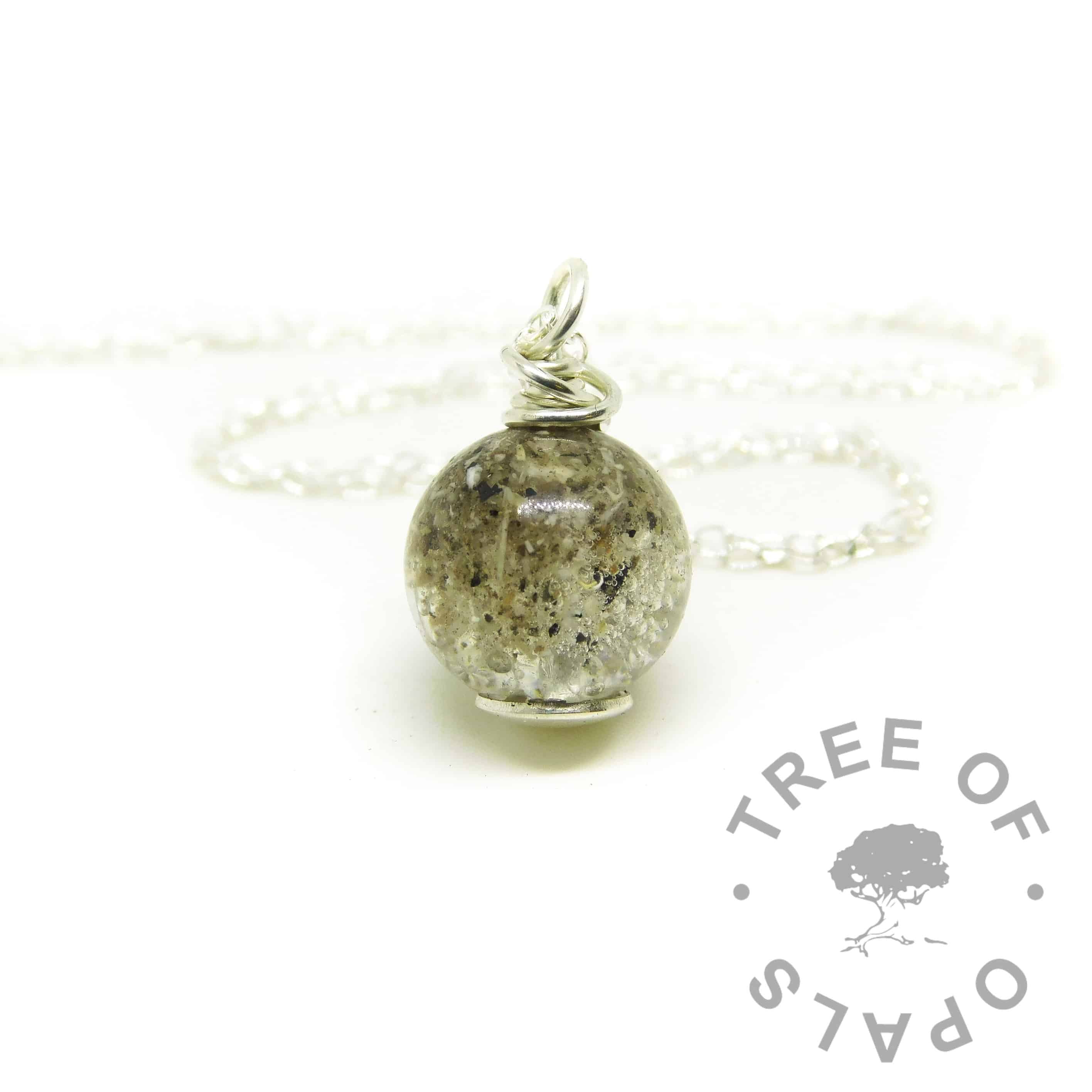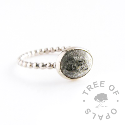Every cremation ashes keepsake jewellery piece we make is completely individual. That’s because the colour of your loved one’s cremation ashes can vary from volcanic black to almost pure white with everything in between. It’s normal to see green, pink and blue along with the white, black and brown flecks in cremains. You can combine them with your loved one’s birthstone or add a colour option or choose classic cremation ashes.