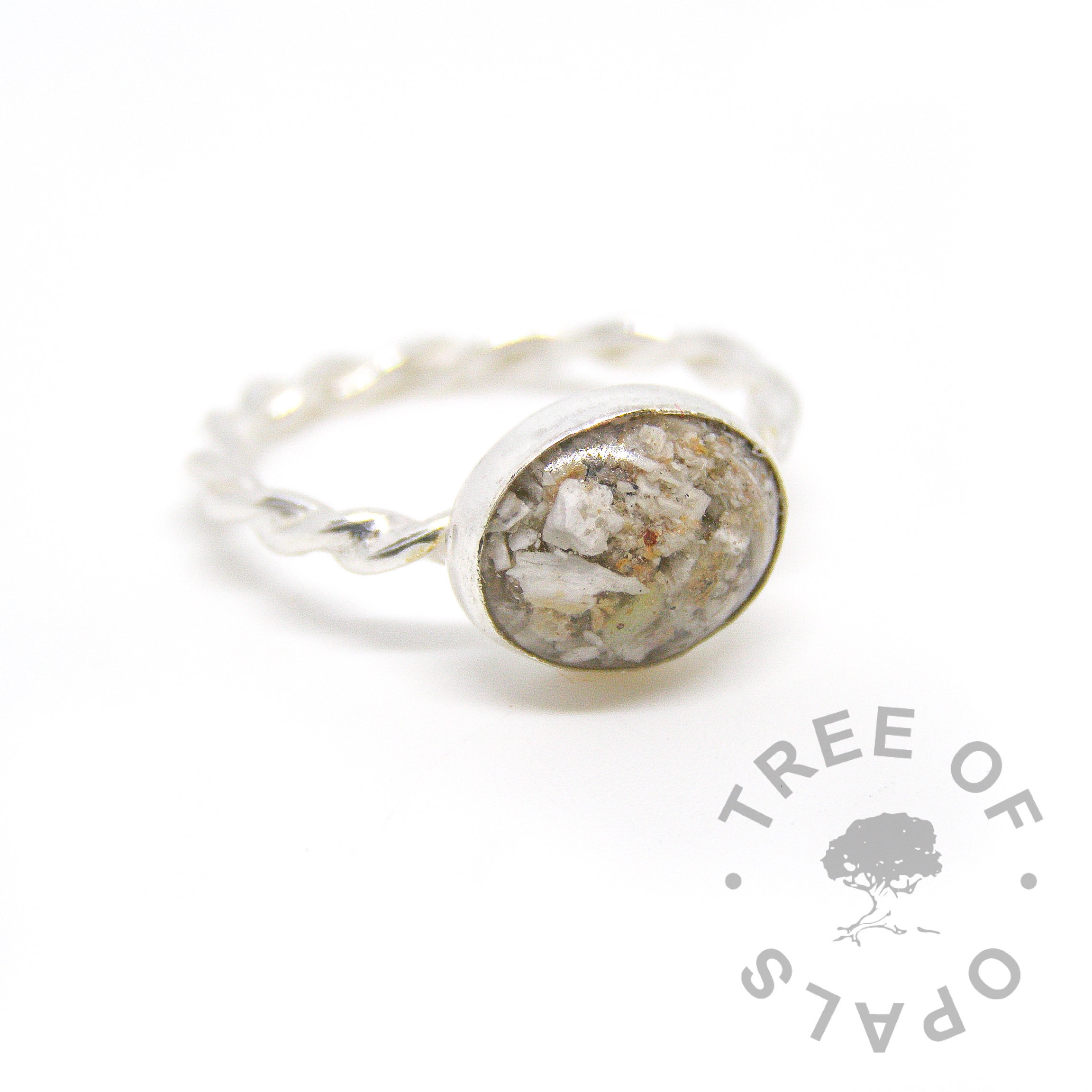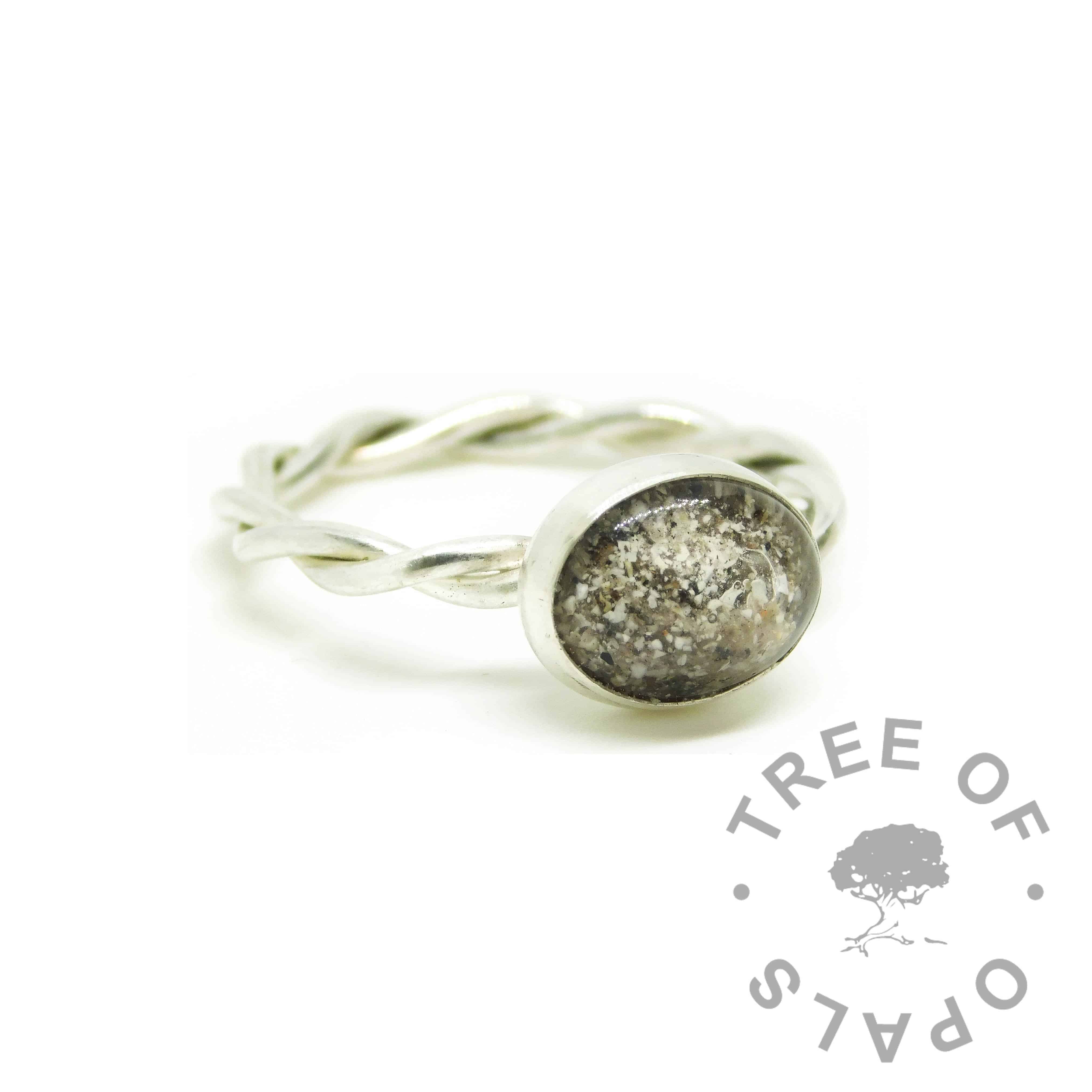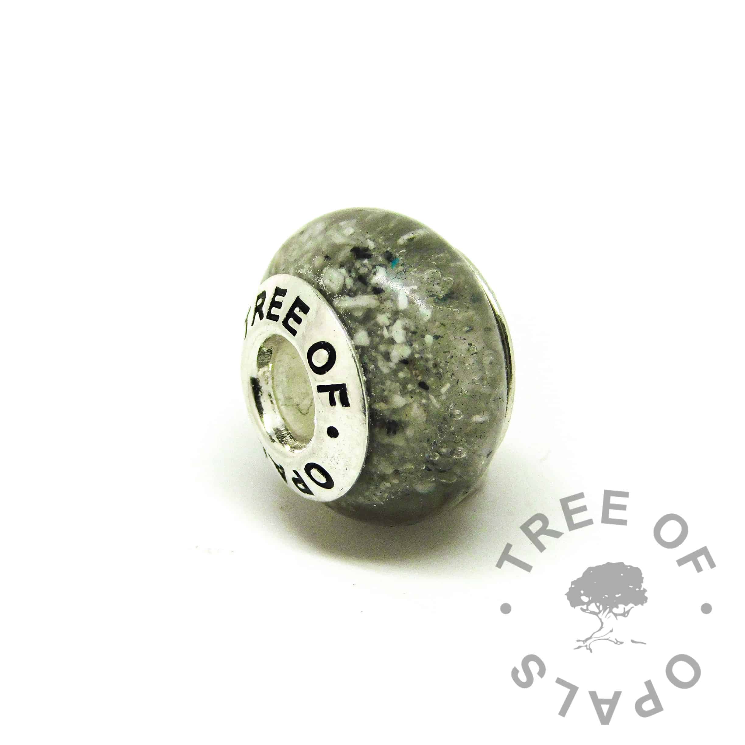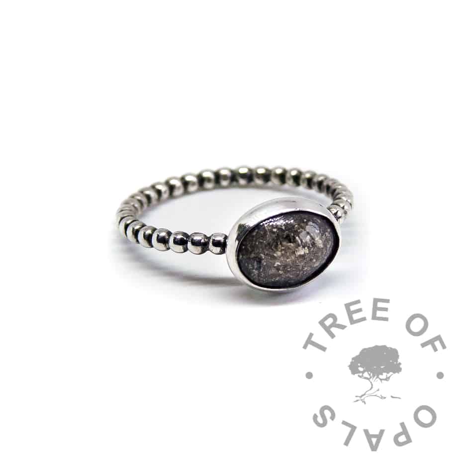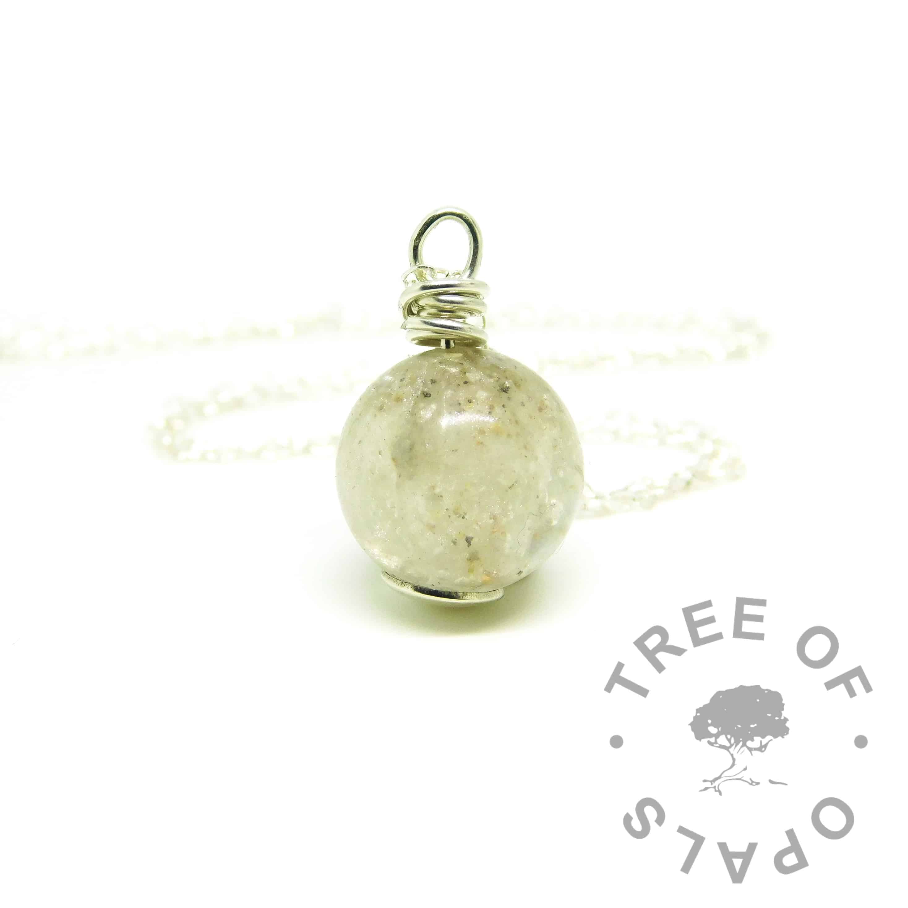 Every cremation ashes keepsake jewellery piece we make is completely individual. That’s because the colour of your loved one’s cremation ashes can vary from volcanic black to almost pure white with everything in between. It’s normal to see green, pink and blue along with the white, black and brown flecks in cremains. You can combine them with your loved one’s birthstone or add a colour option or choose classic cremation ashes.