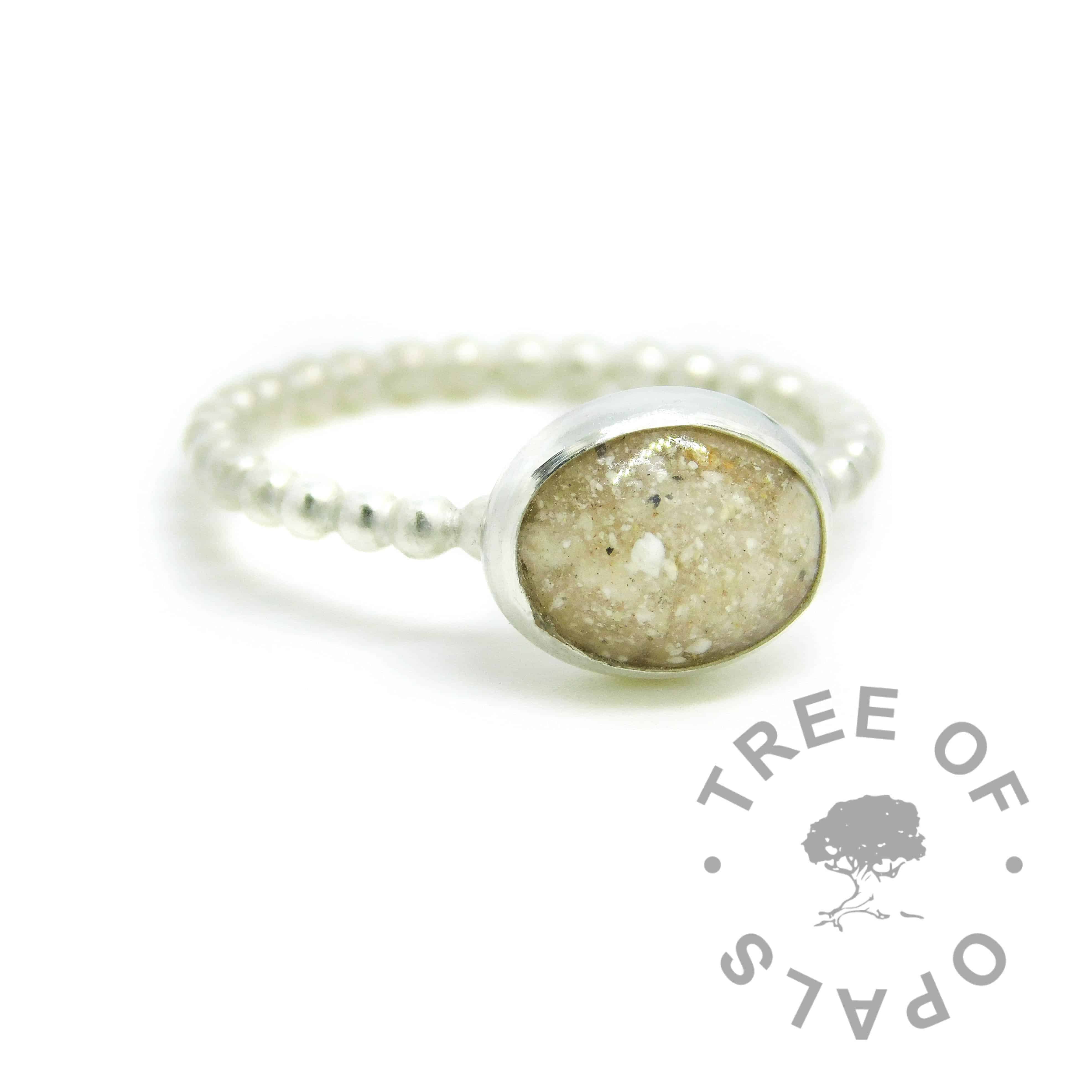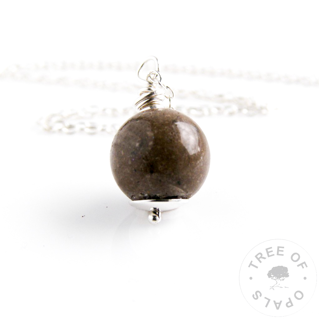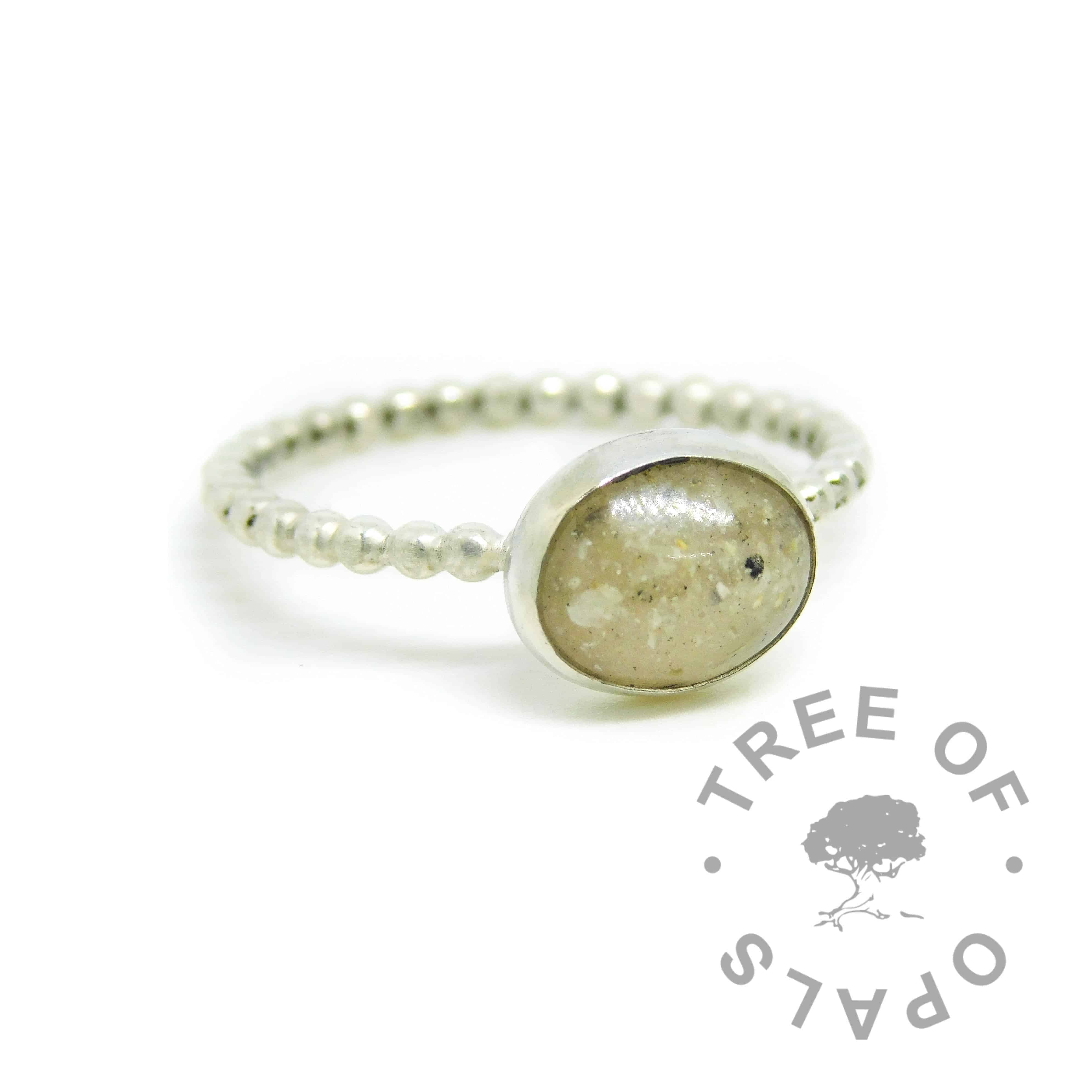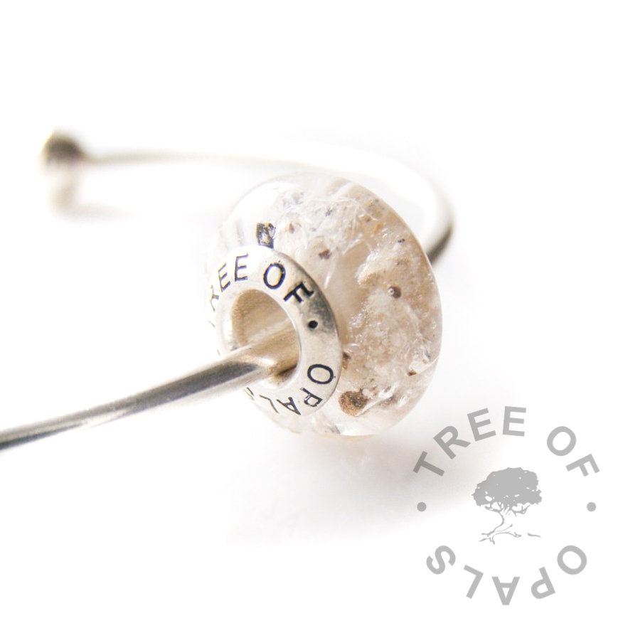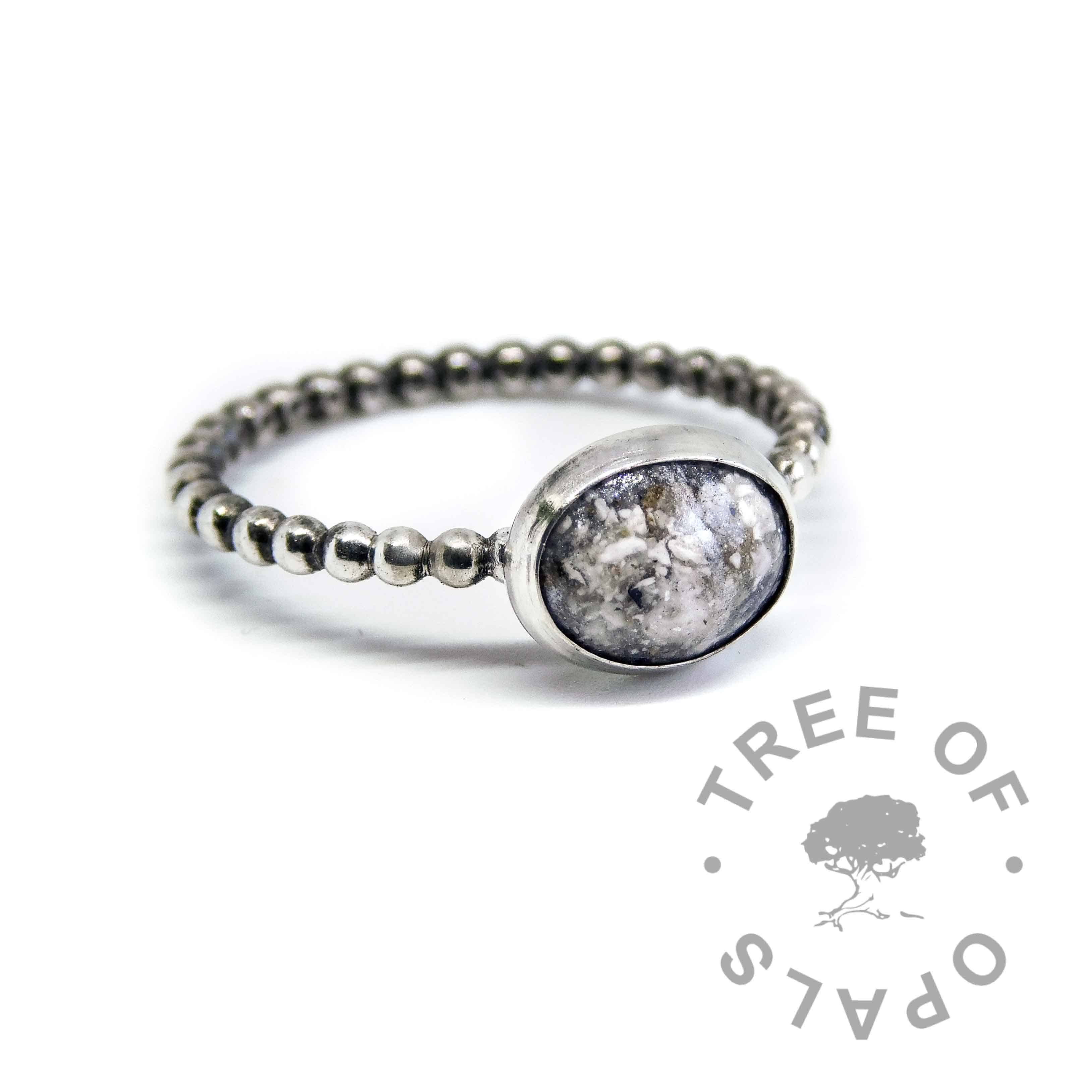 Every cremation ashes keepsake jewellery piece we make is completely individual. That’s because the colour of your loved one’s cremation ashes can vary from volcanic black to almost pure white with everything in between. It’s normal to see green, pink and blue along with the white, black and brown flecks in cremains. You can combine them with your loved one’s birthstone or add a colour option or choose classic cremation ashes.