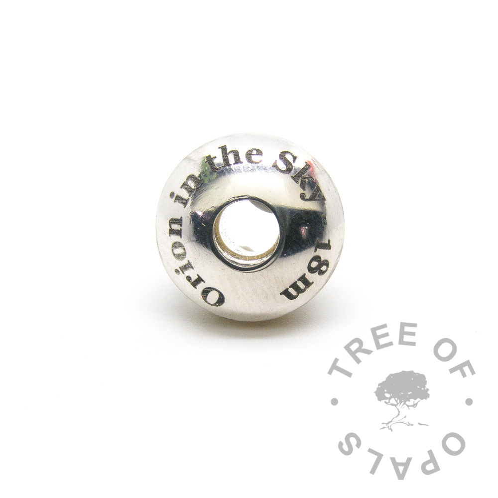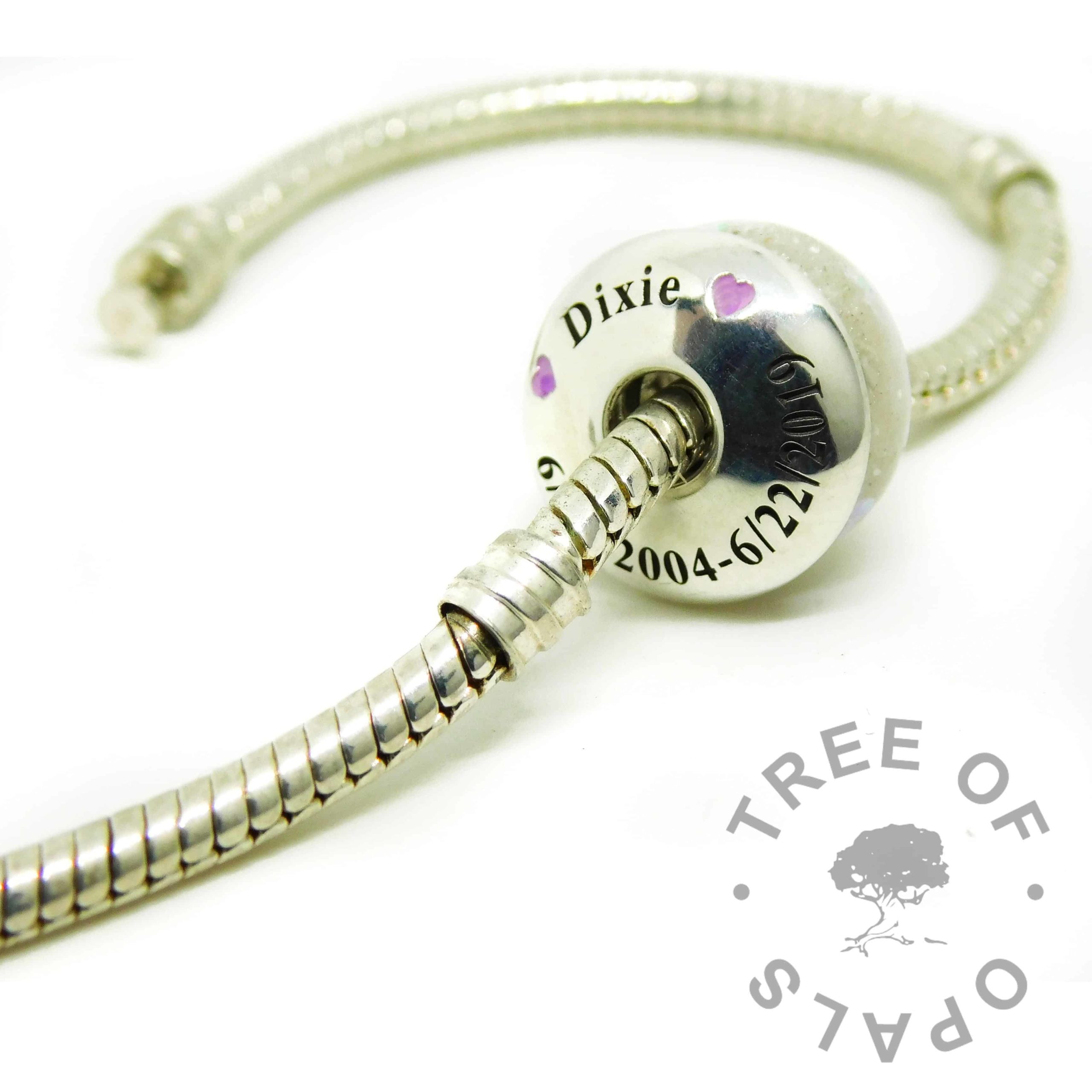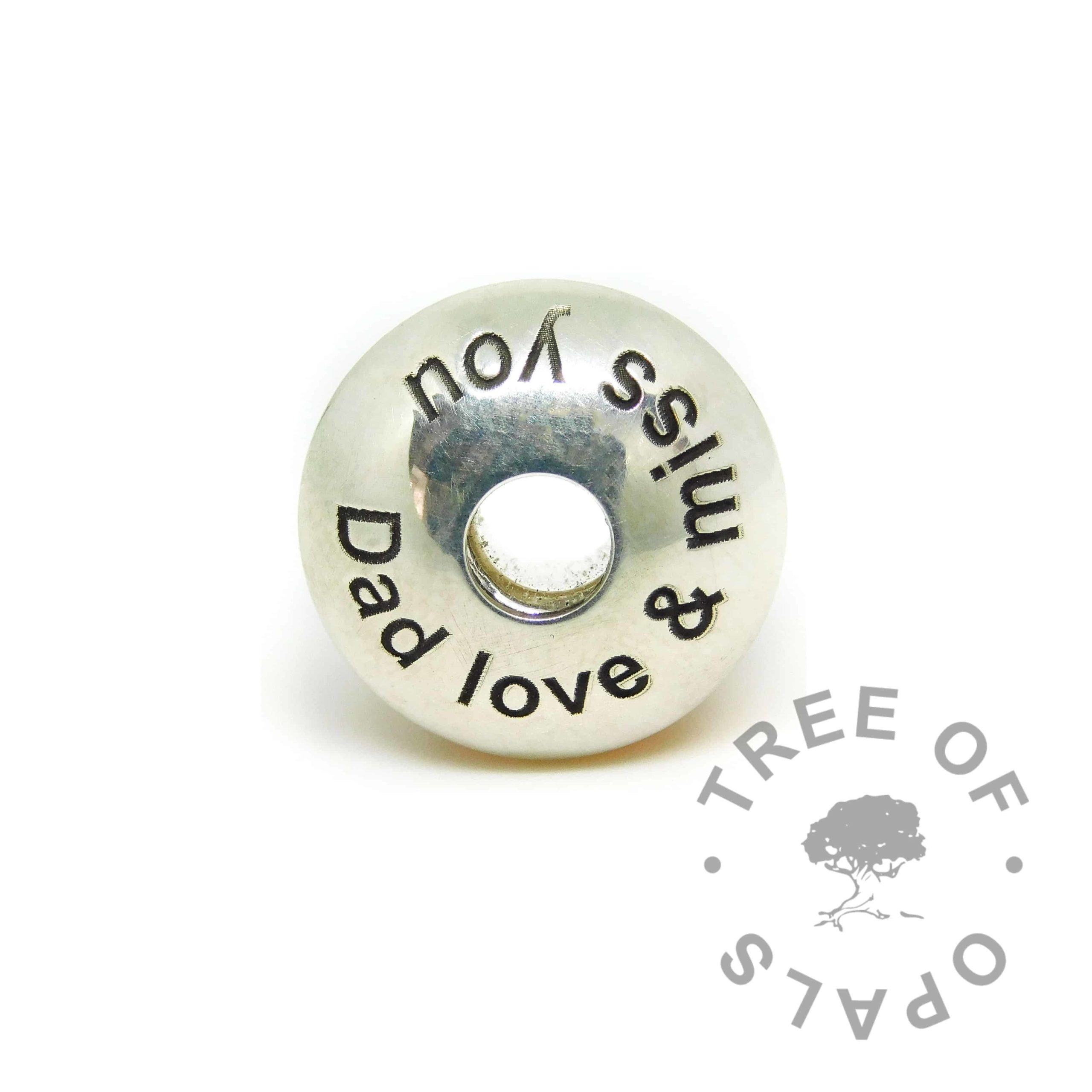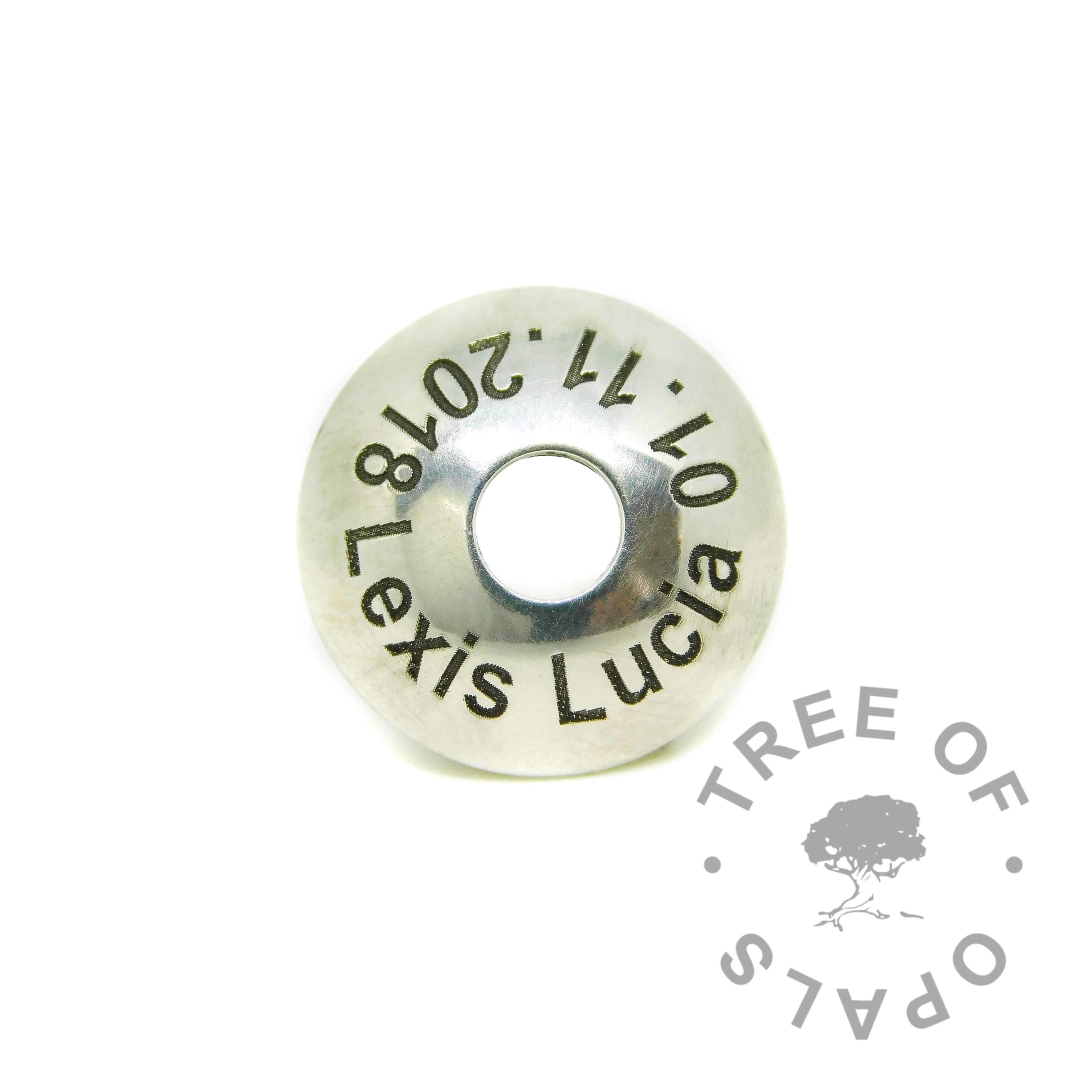 An engravable bead washer is a beautiful way to add some information to your charm bead on a Chamilia or Pandora bracelet. Alternatively, our bead cores themselves can now be engraved too! Can also be handstamped here!