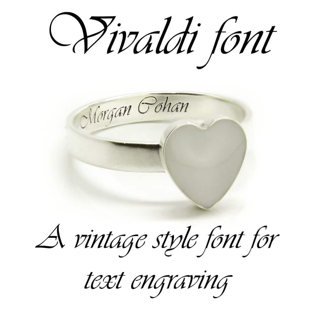 Only available on the flat version of the ring holder necklace! Engravable is done in Arial font as standard, but please let us know if you’d prefer another font such as Times New Roman, Vivaldi, Amazone BT, or Silver South Serif & Script in the comments of the product before adding it to the basket. Click on each font to see it “in action” with your chosen words. We can work with any font, please get in touch to discuss alternatives. We recommend Arial, Times New Roman or Silver South Serif for long messages and the classic band, and handwriting fonts like Vivaldi, Amazone BT or Silver South Script are great for short messages and on larger pieces (not suitable for the classic band as it would be too small to read). You can write *heart emoji* which works better than copy and pasting or adding an emoji to the basket!
