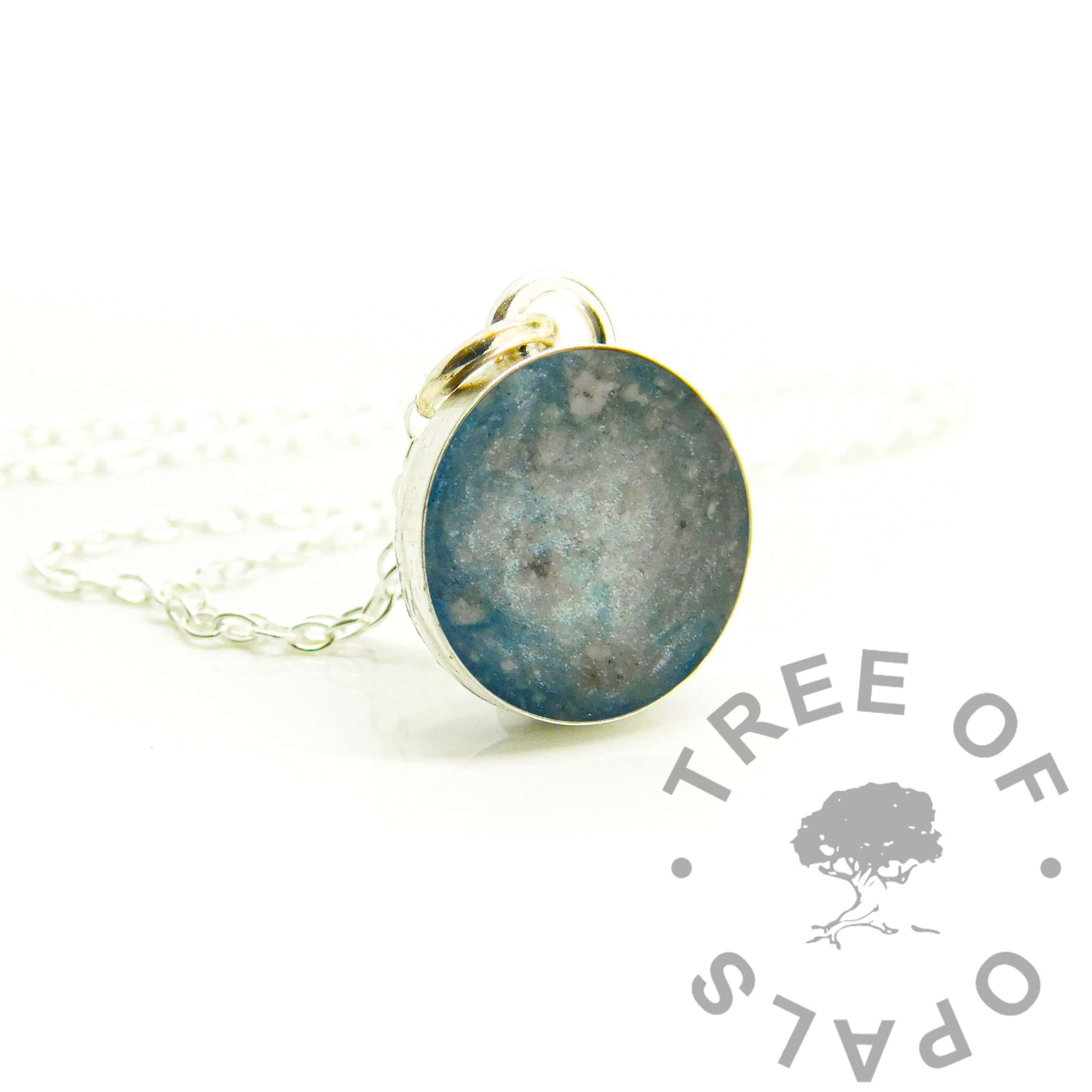 Round Cremains Necklace – in solid sterling silver setting, cremation jewelry for mourning. We lose a person we love, or a pet who has been our companion through thick and thin, we might want a physical way to keep them close.