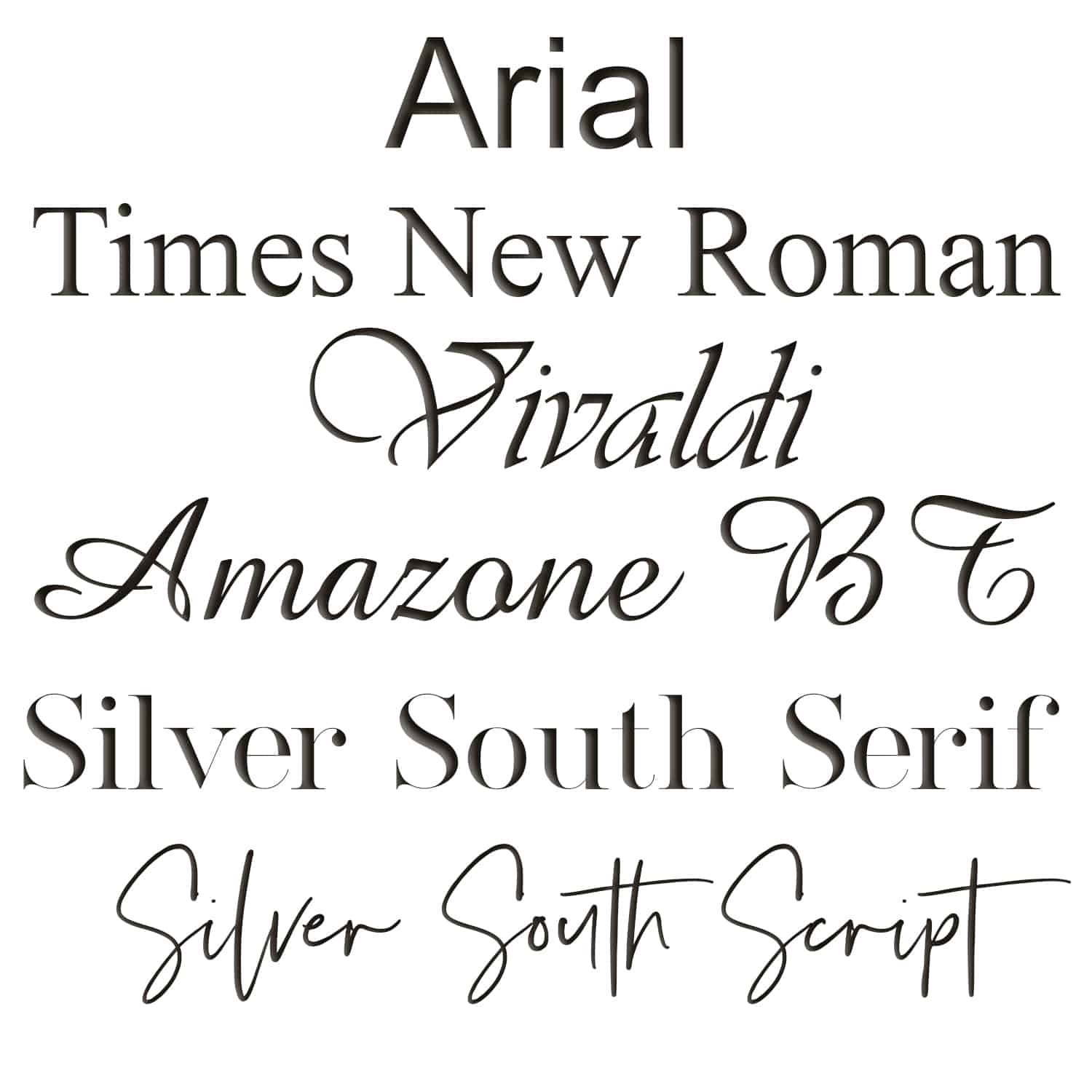 You test out your fonts here: Arial, Times New Roman, Vivaldi, Amazone BT, Silver South Serif & Script