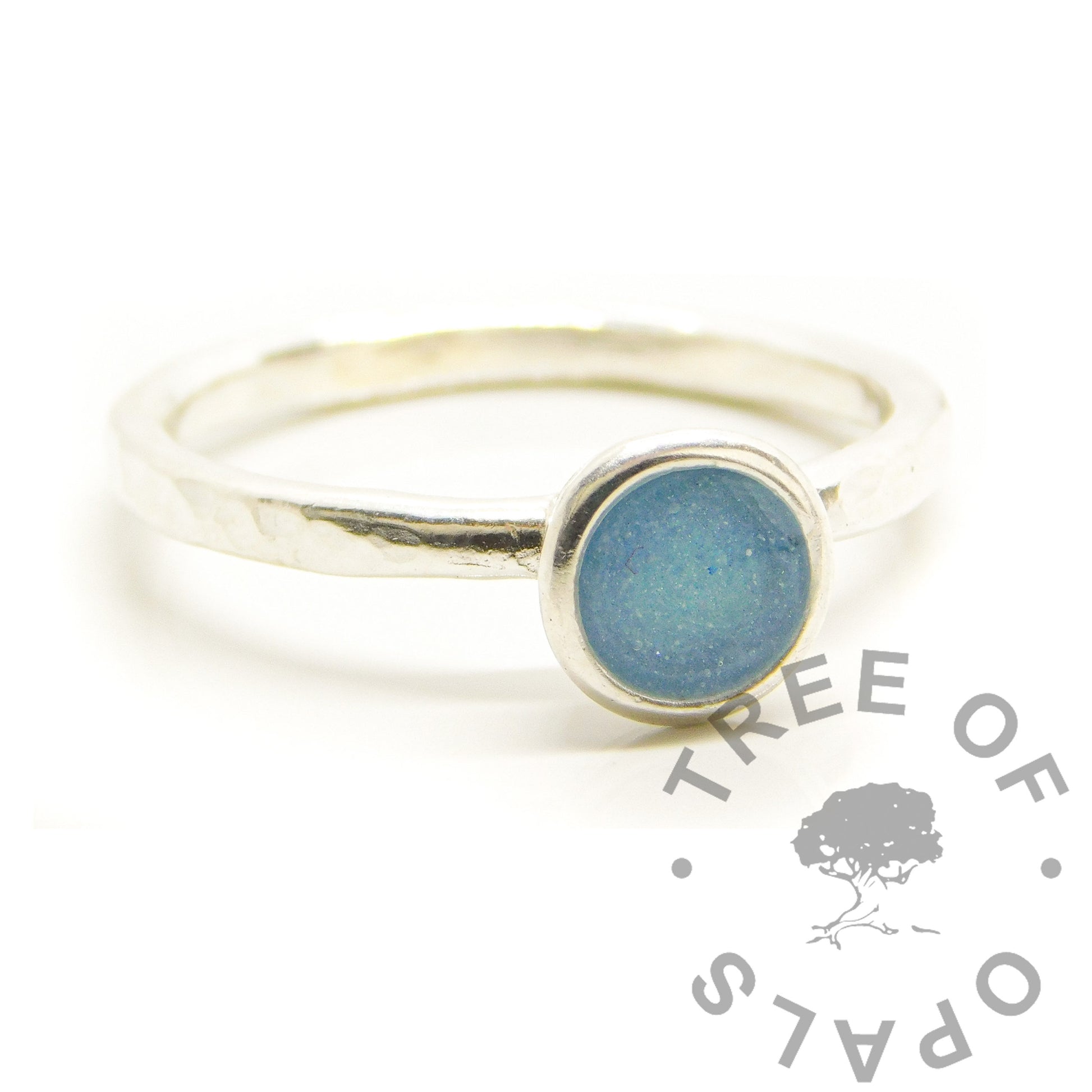 These rings are cast by hand in Scotland from a design Nikki developed for Tree of Opals and their other business, Keepsaker Supplies. Stacking rings can be worn next to one-another and collected just like charm beads. We use Argentium silver for all of our ring bands, which is a little purer than sterling at 93.5% or 94% purity and are less likely to tarnish than sterling. If you'd prefer to DIY this ring then please see the listing here on our sister site Keepsaker Supplies and order it as a breastmilk DIY kit!