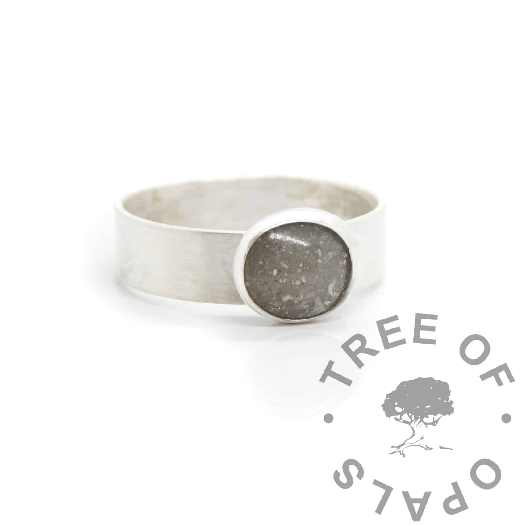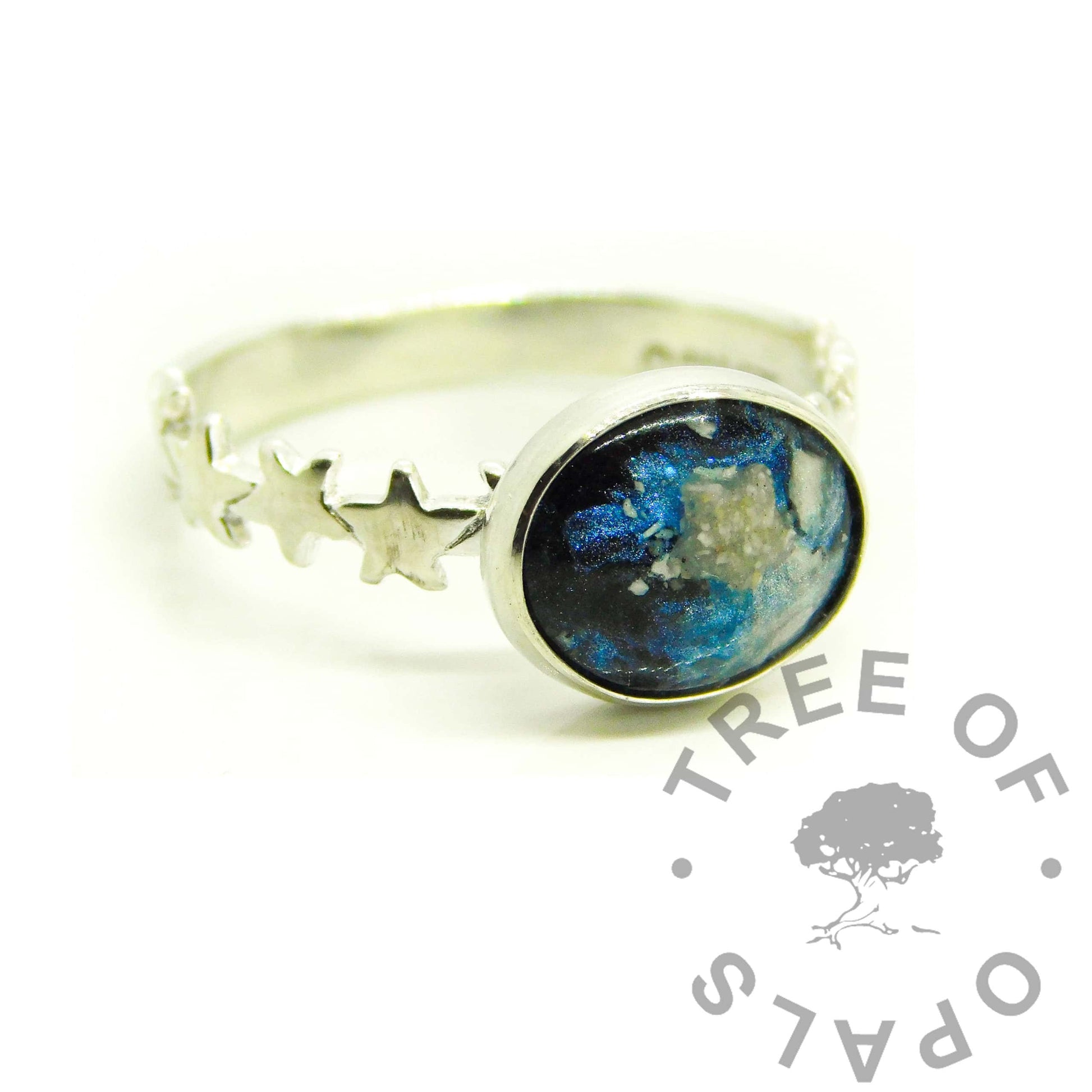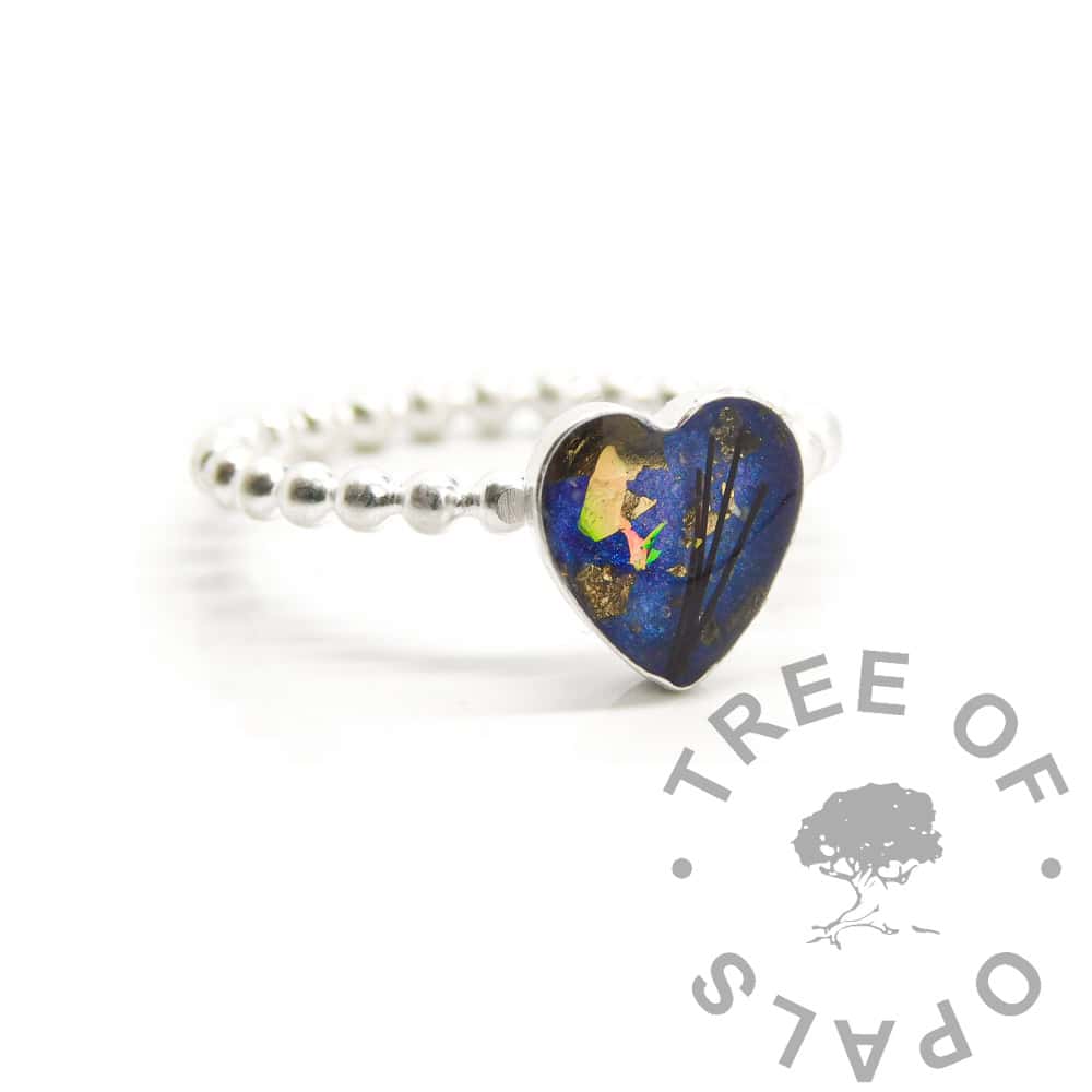 You can choose any colour for the resin and we will either create stones with the ashes or hair, or add them directly to the ring after a few practice goes. If we make stones, you can choose your favourite to add to the ring.